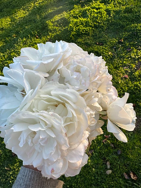 The light at this time of the season lends itself to the gentle. A softening. It starts with foggy mornings that turn to gently warm days. With reaching for the woollen blanket on the back of our couch to curl up under at night in front of the fire, with donning a favourite silky-soft cashmere jumper. Winter is whispering on the evening air, in the crispness of the night sky. We stand outside at night with the dogs, watch the stars glitter. Weekends are spent chopping wood, bundling the kindling around our property into neat piles, collecting buckets of pine cones, picking the last bounteous flush of roses. We know what’s coming, the bite of winter is stronger each morning we wake, the leaves on the Elm and Oak that stand sentry by our home are finally tipped in gold so it won’t be long now, they’re always the last to turn. We linger as long as possible in the garden bathed in the afternoon glow.