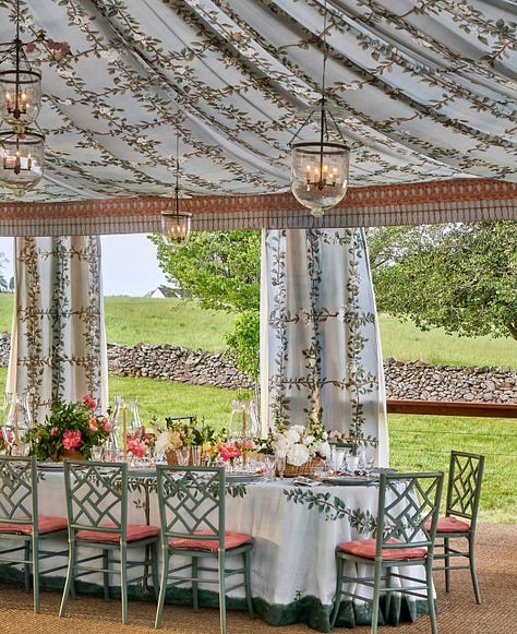 @degournay’s recent accouncement and instagram posts about their match made in heaven new Bunny Mellon collection. They hosted a dinner at Oak Spring Garden to launch the collection under a handpainted canopy of their crabapple arbor design. The videos and photos are a treat for the eye.